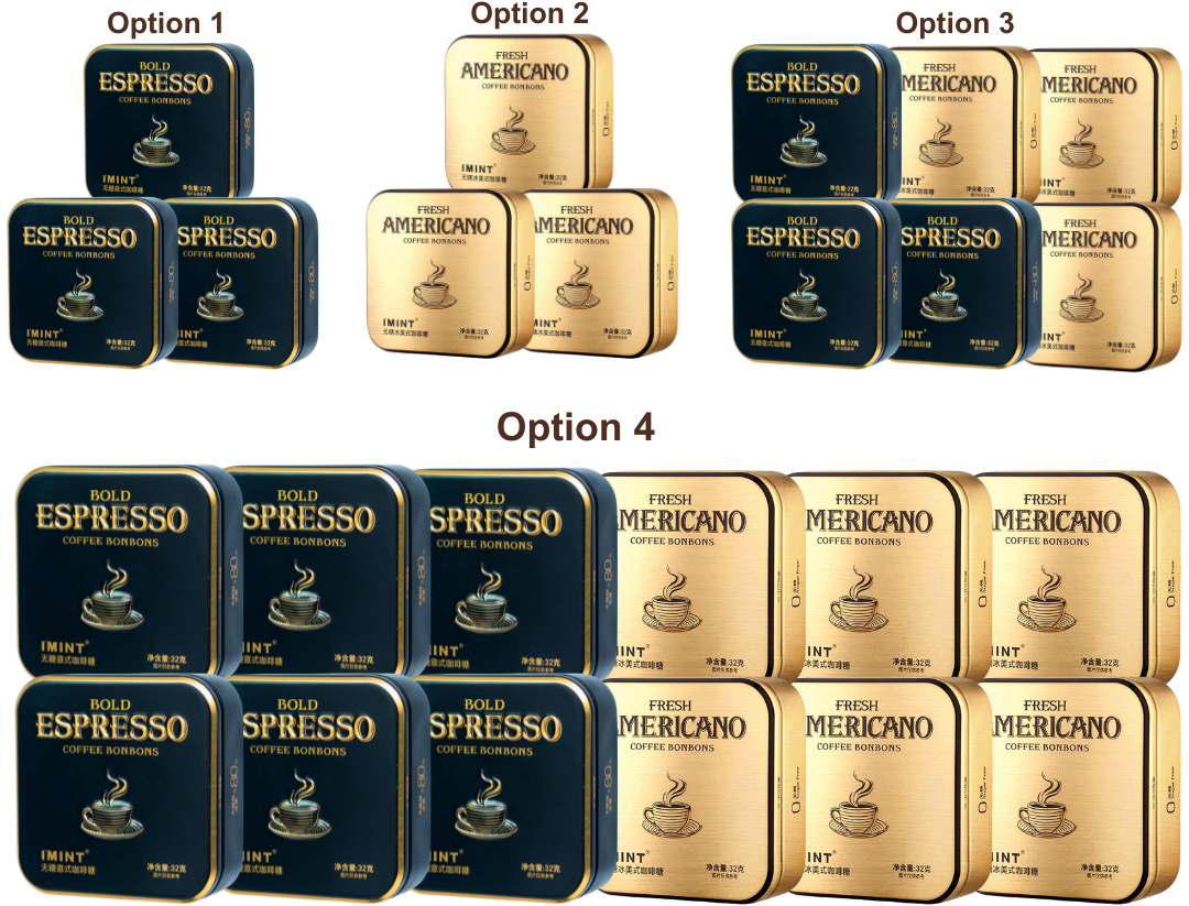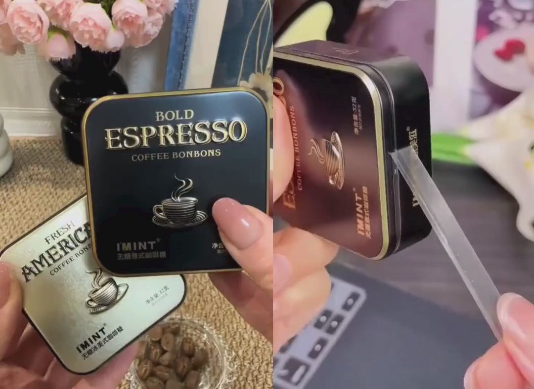 Each tin contains about 19 coffee-bean-shaped mints (32 g)