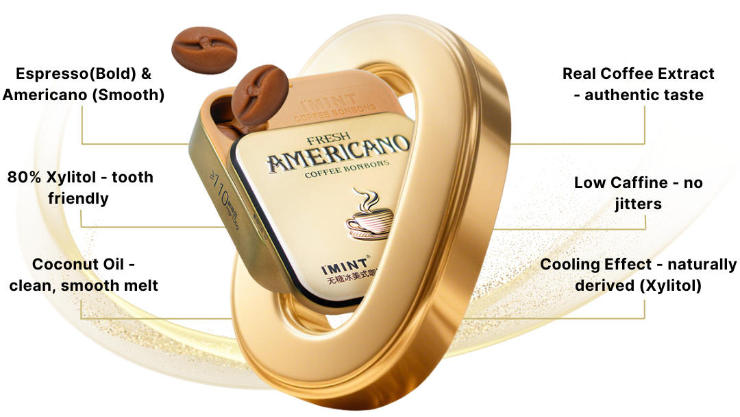 - Fresh Americano: smooth, ~110 mg caffeine per 100 g. Ingredients: Xylitol(87.5%), Refined Coconut Oil, Coffee Powder(4%), Salt, Sucrose Fatty Acid Esters, Artificial flavour.
